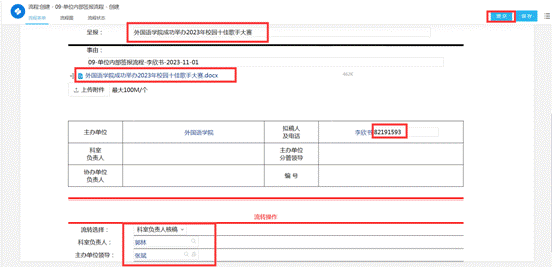 2.填写稿件信息,包括“呈报”(新闻标题)、拟稿人电话,并上传新闻原文附件。“流转选择”选择“科室负责人核稿”,“科室负责人”选择发稿部门的分管副院长,“主办单位领导”选择院长或党委书记,提交。