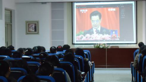 首先,伴随着吴邦国委员长的一声“全体起立”,学院到会的党员们也全体起立,唱响了国歌。随后大家认真听取了胡总书记做的题为《坚定不移沿着中国特色社会主义道路前进,为全面建成小康社会而奋斗》的十八大报告。在近2个小时的收看过程中,大家聚精会神,认真做着笔记。