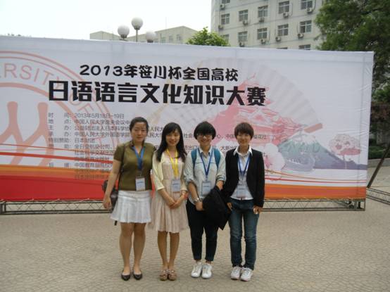 由日本财团赞助、日本科学协会和中国人民大学主办的“2013年笹川杯全国高校日语语言文化知识大赛”于5月17日至19日在中国人民大学举行。我校awc777万象城娱乐官网日语系青年教师文慧超带领2009级王春冬、林津熙、肖宇凡三名同学参加了比赛。我校选手从来自全国的60支参赛队、近200名选手中脱颖而出,凭借默契的配合和优异的表现以复赛小组第一的成绩进入半决赛,成为黑龙江省参赛队中唯一进入半决赛的参赛队,并最终取得了团体优秀奖的佳绩。