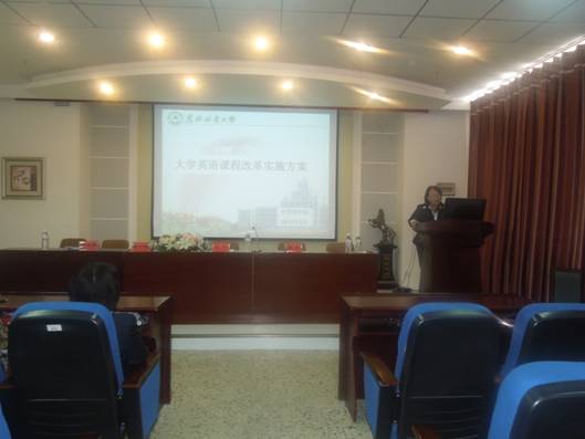 首先,王丹院长作了题为《大学英语课程改革实施方案》的报告,分别从实施背景、总体思路、课程设置、教学模式和评估体系五个方面详细而全面地向大学外语部全体教师解读了大学英语课程改革的具体实施方案。辛淑英书记发表重要讲话,积极动员万象城官网大学外语部全体教师尽快适应大学英语改革,调整心态、正确面对本次改革带来的各种困难,服从学校和学院的各项工作安排。