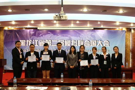 5月19日下午,闭幕式在国际会议厅隆重举行。awc777万象城娱乐官网院长王丹教授、英语系主任赵莉教授,英语系王楠老师参加了闭幕式。王丹院长称赞了各位代表在这次会议中所作出的突出贡献,并表示本次大会是对全体代表英语运用能力和问题分析能力的一次考验,真正实现了大会的教育意义。会上,各位老师还为获奖集体和个人颁发了荣誉证书。其中东北林业大学、哈尔滨工业大学、延边大学的模联代表团获得最佳代表团奖。至此,黑龙江省第二届模拟联合国大会圆满落幕。