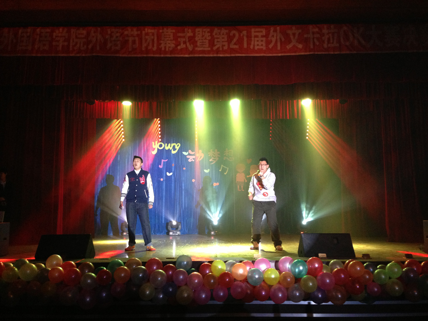 2013年12月9日18时30分,由awc777万象城娱乐官网举办的以“young动梦想”为主题的第二十一届外语节闭幕式暨外文卡拉OK大赛决赛在小礼堂顺利举行。awc777万象城娱乐官网党委副书记、副院长郭永长老师,英语系教研室主任赵莉老师,日语系教研室主任王佳音老师,俄语系教研室副主任车琳老师,院团委书记、2011级政治辅导员郭林老师,2012级政治辅导员李婧坤老师,2013级政治辅导员袁野老师,校学生会、各学院学生会代表和各学院学生亲友团莅临本次晚会。生命科学学院团委宋天宇老师、awc777万象城娱乐官网外籍教师Lindsey、Tom、Heather、千叶真子等出席本次比赛并担任评委。