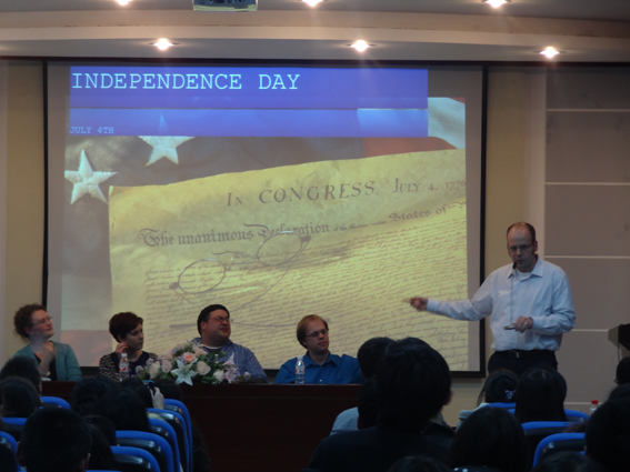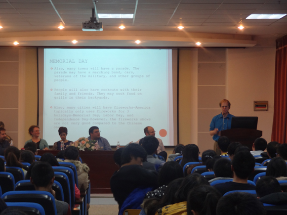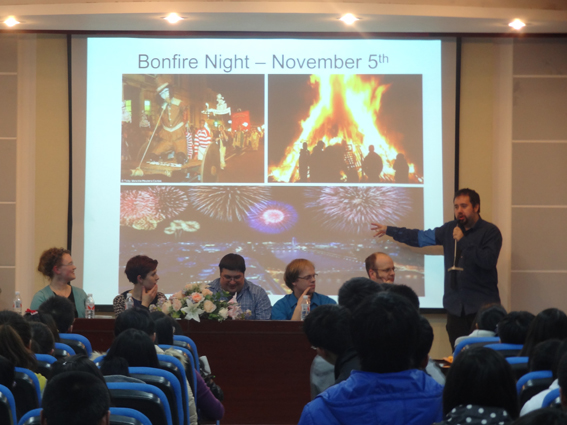 这次讲座是以西方节日为切入点,主讲教师通过介绍西方节日起源、发展及庆祝方式,展示了其深厚的文化背景。六位外籍教师轮番上阵,用风格迥异的演讲方式介绍了各种各样的西方节日,并精心准备了图文并茂的PPT为演讲添彩。Heather老师声情并茂地将万圣节的起源发展和经典的“Trick or Treat”的由来娓娓道来;Thomas老师以英国绅士特有的幽默方式讲述了Bonfire’s Night和关于Guy Fawkes的一段历史故事;女教师Lizzie带领同学们穿梭于美、法之间,领略Mardi Gras、Lent和Easter节日的异域风情;金发外教Micah向同学们介绍了在美国人们是如何度过Memorial Day和Labor Day假期的,还风趣地介绍了一个新奇的节日——π Day;Steven老师则用自己的实际经历介绍了外国人的Father&Mother’s Day;最后,由Ben老师介绍了美国人的国庆节——Independence Day。外教发言环节结束之后,Ben老师鼓励同学们大胆举手勇敢地向外教们提出问题,几位外教也对同学们的问题一一耐心地解答。整场讲座气氛活跃,同学们不时被外教们的幽默打动,报以热烈的掌声。在讲座结束后的自由交流环节,同学们围坐在一起,纷纷与外教沟通交流。