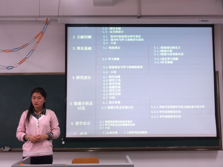 答辩会共分为5组,在文博楼0801、0805、0809、0814、0815五个教室同时进行,分别为语言学方向、文学方向、文化/教学法方向、翻译方向。共有94名学生参加本次答辩会。首先由学生陈述选题依据,包括课题研究的意义、研究的现状、主要参考文献,并且提出研究方案,包括主要研究内容、研究方法和研究进度安排。最后,由导师对选题进行评价,提出修改意见。