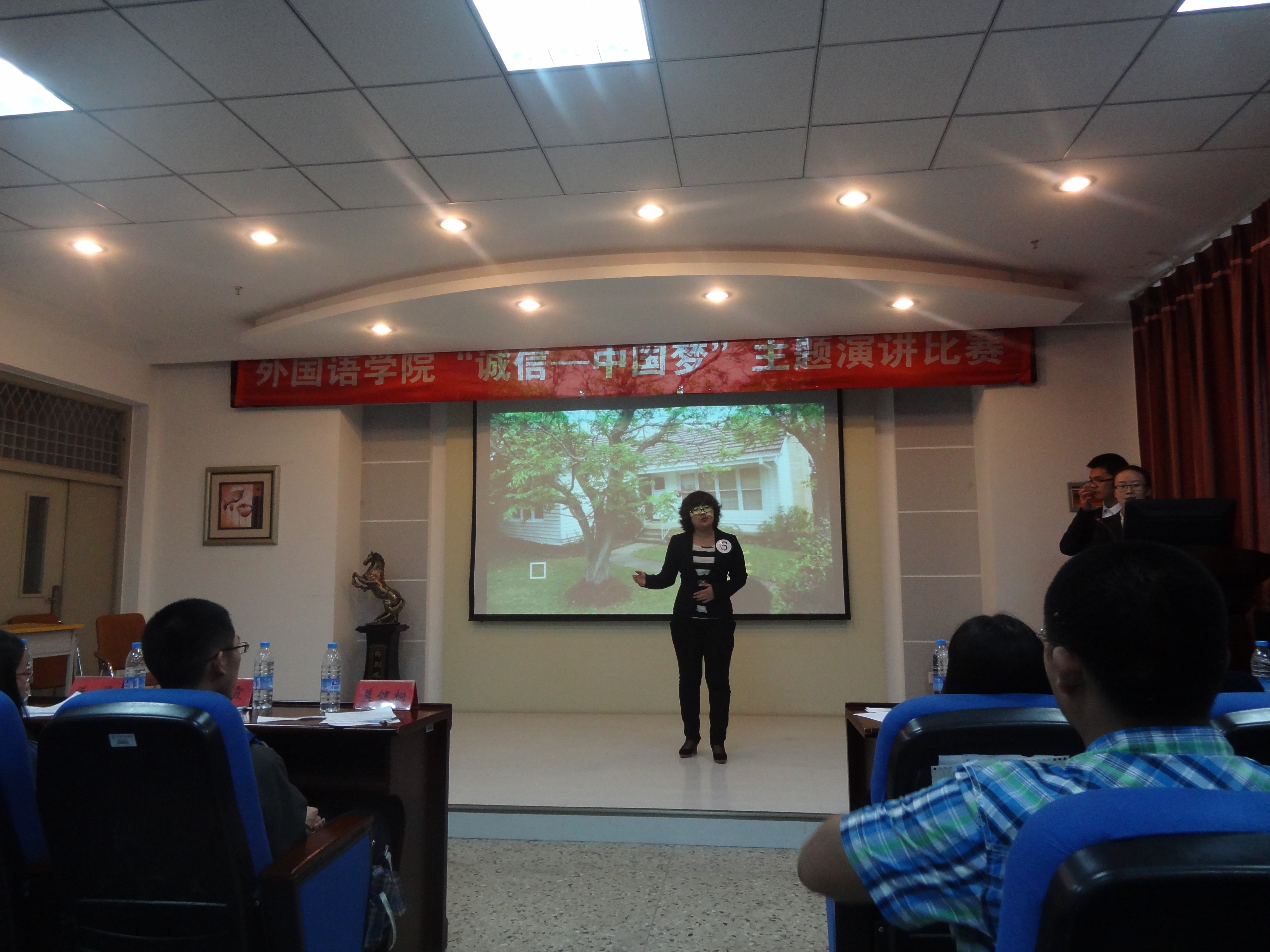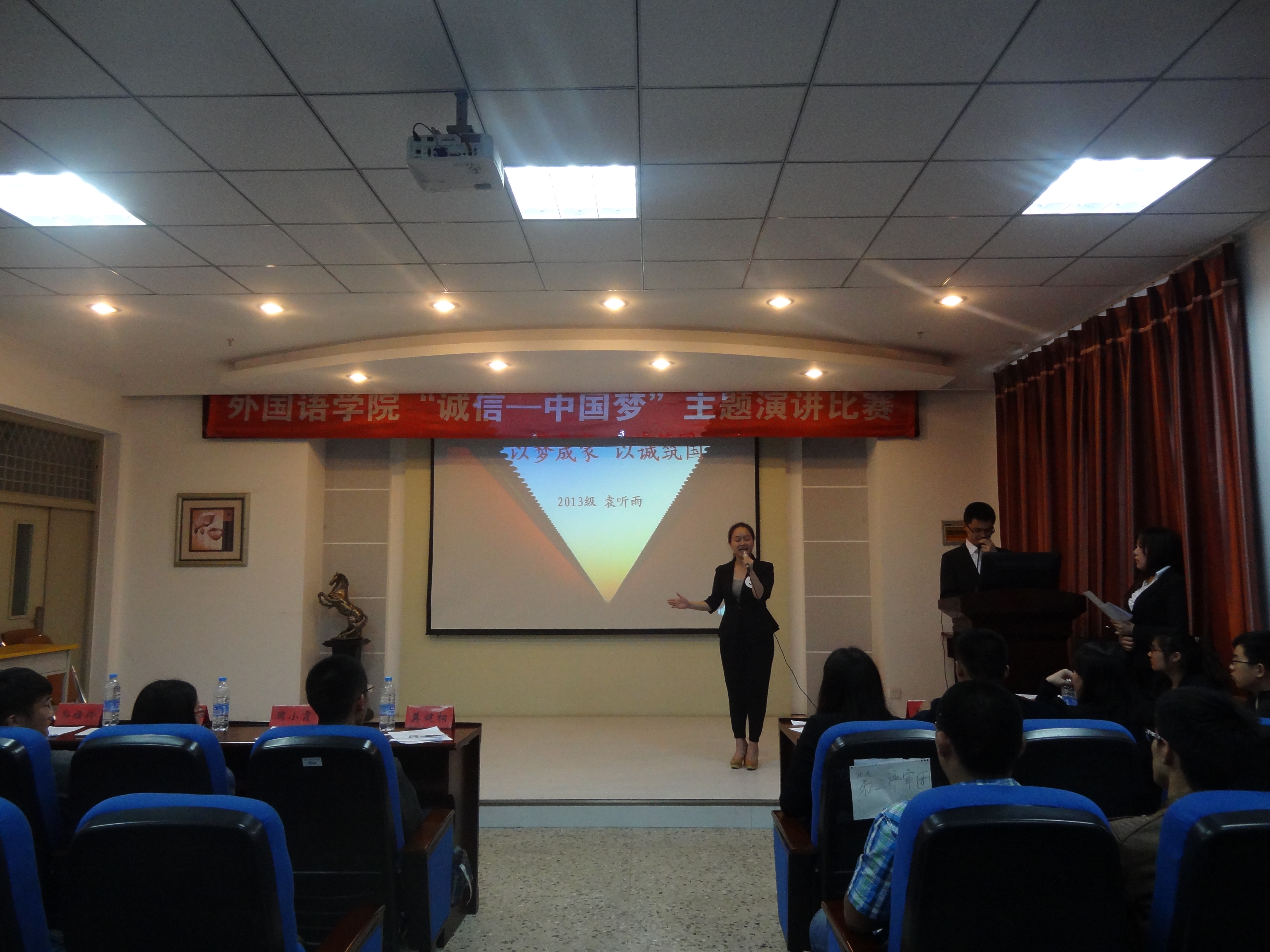 在主持人宣读了比赛规则后,比赛正式拉开帷幕。来自12级和13级各班的参赛选手借助于现场的多美体设备,引经据典,借古喻今,通过形式多样、内容丰富的主题演讲阐释了自己对于诚信、对于中国梦的见解。最后,主持人宣布比赛成绩,2013级英语四班袁听雨等9名同学最终获奖。