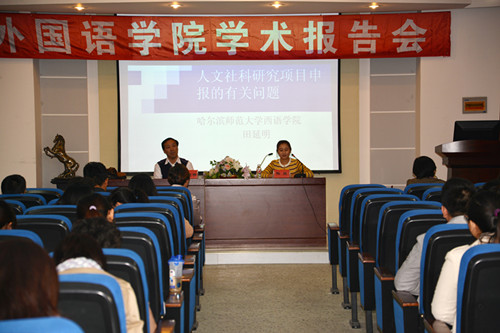 2014年10月8日下午1点40,哈尔滨师范大学西语学院田延明教授在文博楼1019室作了题为“人文社科研究项目申报的有关问题”的报告。报告会由孙爽副院长主持,awc777万象城娱乐官网全体老师和部分硕士研究生聆听了此次报告。